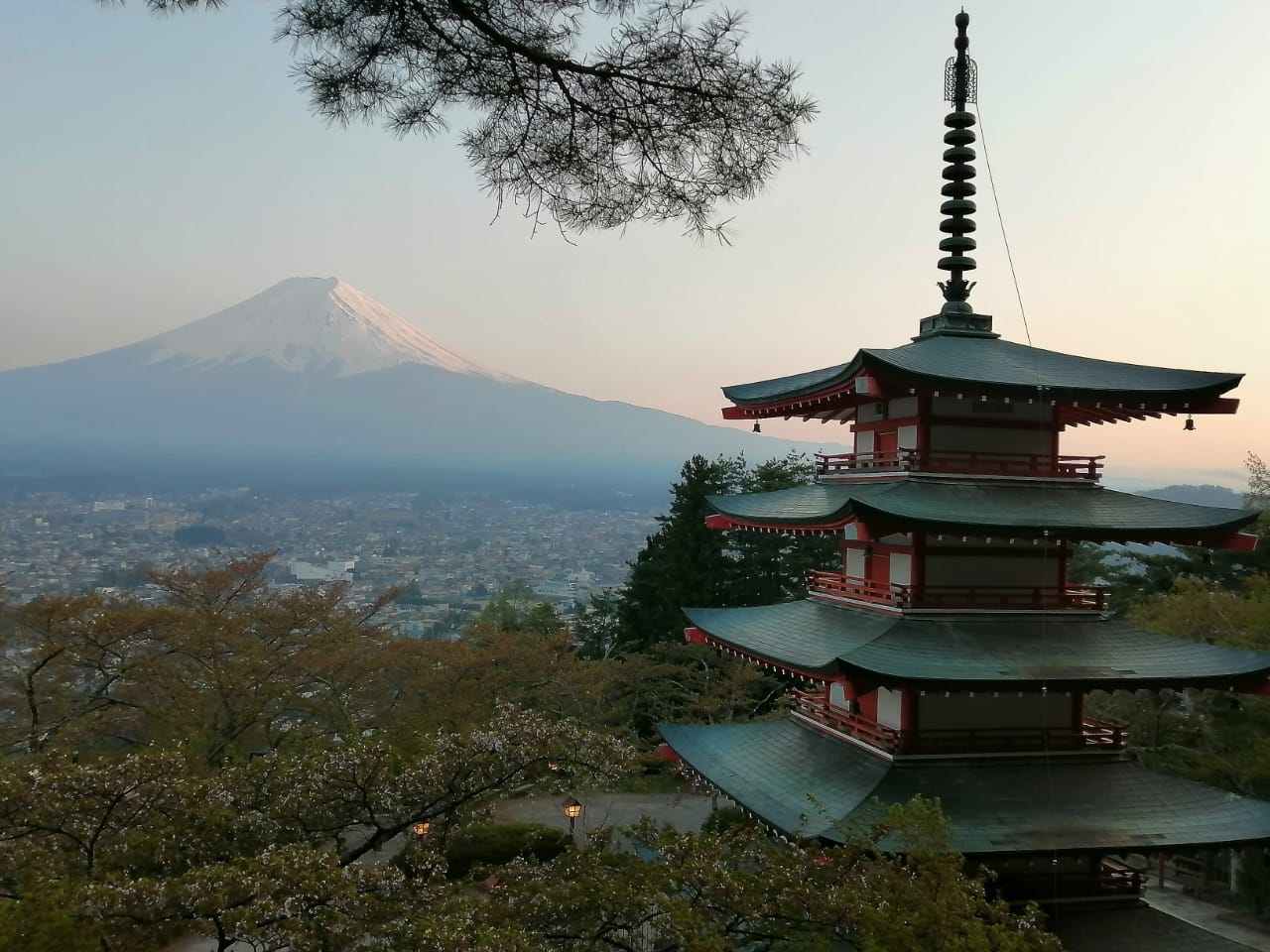 Es un lugar perfecto para ver como el sol se va ocultando detrás del Monte Fuji, si tienes suerte podrás ver uno de los atardeceres más bonitos y además cuando bajes verás todas las luces encendidas, un lugar que enamora realmente.